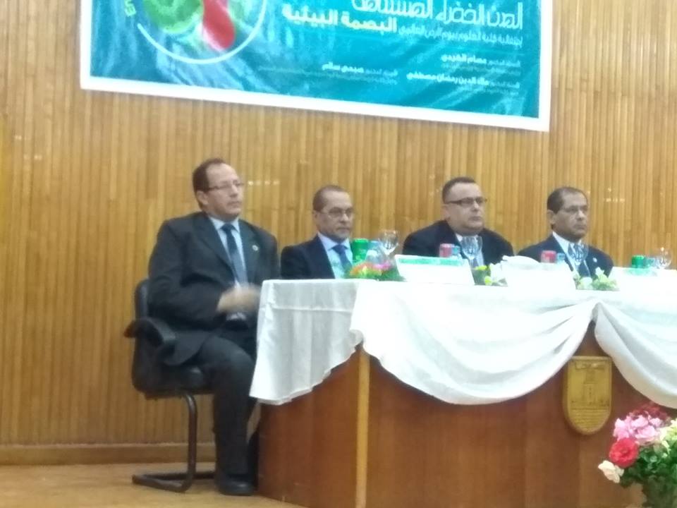 واشار الدكتور عـلاء رمضان، عميد كلية العلــوم و رئيس المؤتـمر ان موضوع الاحتفالية "البصمة البيئية" تتعلق بالجنس البشرى الذى يستغل الموارد الطبيعية خاصة فى ظل وجود ازمة فى قلة الموارد البيئية مؤكدا على احتياج سكان مصر الى 6 اضعاف الموارد المتاحة حاليا وان علاج ذلك يكون عن طريق الحد من الزيادة السكانية و زيادة مساحة الرقعه الزراعية و تحديد الاجراءات التى تحفظ مواردنا الطبيعيه من اجل مستقبل مصر .
