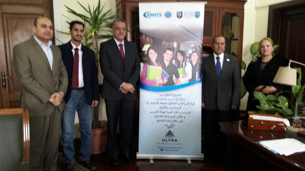 اجتمع الدكتور محمد إسماعيل عبده إبراهيم، نائب رئيس جامعة الإسكندرية لشئون فرع مطروح والدكتورة دلال عبد الهادى القائم بعمل عميد كلية السياحة والفنادق بمطروح يوم الاثنين الموافق 29/1/2018 مع كل من أ/ هشام ضرغام – رئيس مجلس إدارة شركة كومسيس للبرمجيات ، أ/ محمد محمود حسين – مدير الموارد البشرية بالشركة ، ا/ سعيد زعزوع من إدارة التدريب للاتفاق علي بروتوكول تعاون مشترك بين الطرفين لتدريب طلاب كلية السياحة والفنادق جامعة الإسكندرية فرع مطروح على أنظمة إدارة المكاتب الامامية والحجز الفندقى وذلك تحقيقا لاحد اهداف الفرع الرئيسية في الاهتمام بجانب التدريب العملى لصقل قدرات الطلاب واكسابهم المهارات المطلوبة التي تؤهلهم لسوق العمل ومواجهة متطلبات العصر من كفاءات قادرة على استخدام التكنولوجيا الحديثة ونظم المعلومات وعلى الأخص في مجال الفنادق.