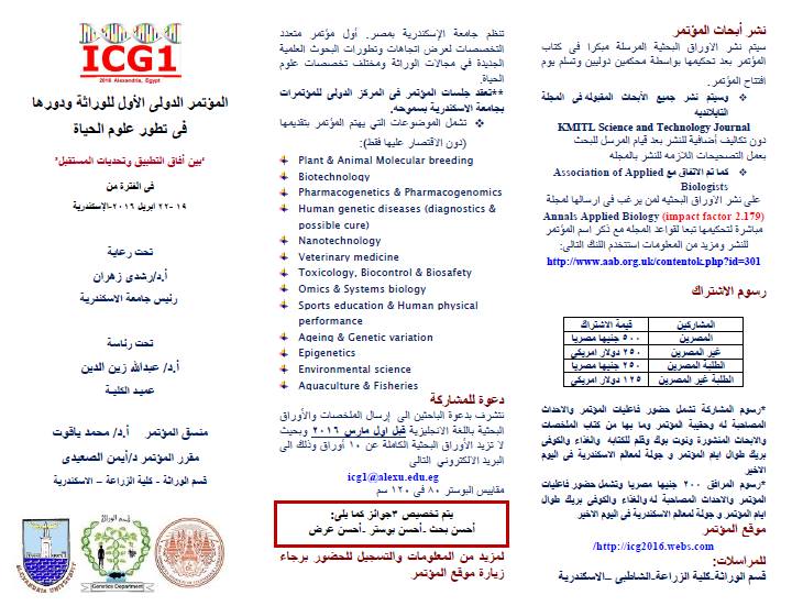 تنظم كلية الزراعة جامعة الاسكندرية خلال الفترة من 19 إلى 22 ابريل 2016، المؤتمر الدولي الأول للوراثة ودورها في تطور علوم الحياة، وذلك تحت رعاية الأستاذ الدكتور رشدي زهران، رئيس الجامعة، وبرئاسة الدكتور عبد الله زين الدين، عميد الكلية .