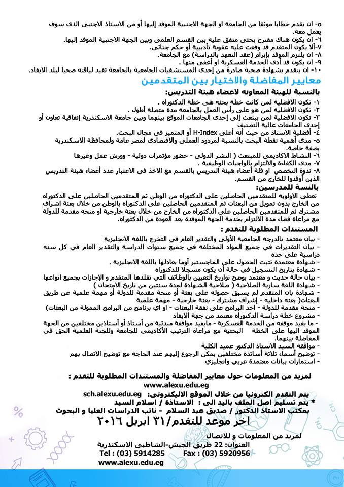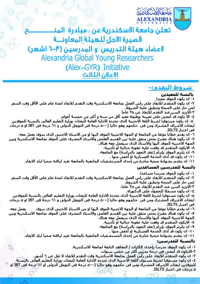 تعلن جامعة الاسكندرية عن مبادرة المنح قصيرة الأجل للهيئة المعاونة لأعضاء هيئة التدريس والمدرسين (3-6) أشهر، علمًا بأن آخر موعد للتقدم 30 ابريل 2016