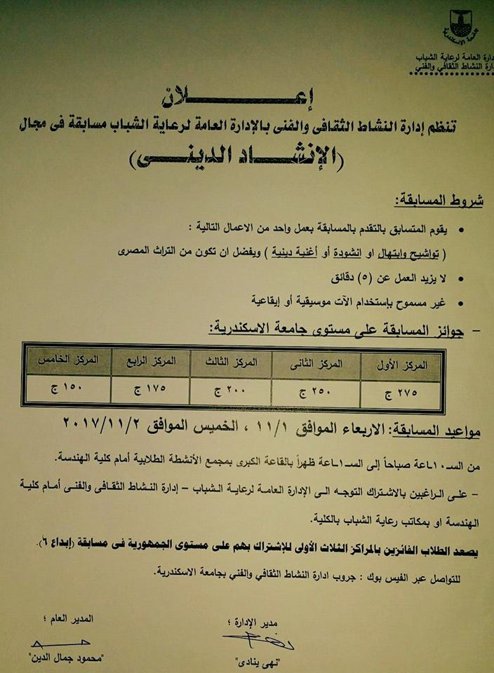 أعلنت نهى ينادي، مدير إدارة النشاط الثقافي والفني بالإدارة العامة للشباب جامعة الاسكندرية عن تنظيم مسابقة في مجال الانشاد الديني، يومي 1 و2 نوفمبر 2017 .