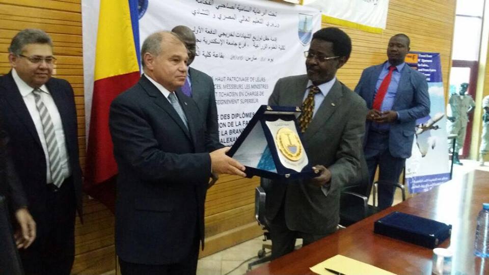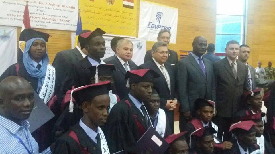 احتفلت جامعة الاسكندرية بالعاصمة التشادية انجامينا بحضور ا.د اشرف الشيحى وزير التعليم العالى والبحث العلمى والبروفيسور مكاى حسن وزيرالتعليم العالي بدولة تشاد وا.د رشدى زهران رئيس جامعة الاسكندرية وا.د على عبد الرحمن حجار رئيس جامعة انجامينا وا.د هشام جابر نائب رئيس جامعة اﻻسكندرية لشئون التعليم والطلاب والسيد ادهم نجيب السفير المصرى بتشاد بتخريج الدفعة اﻻولى لطلاب كلية الزراعة فرع جامعة اﻻسكندرية بانجامينا وعددهم 20 طالب وذلك بقاعة اﻻحتفاﻻت بكلية الطب انجامينا.